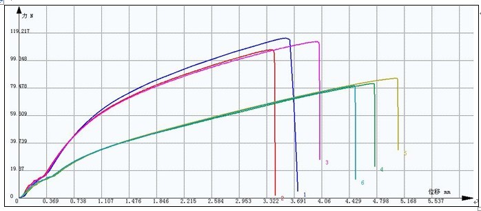 試驗方案:紙板拉伸試驗方案需求單位:某印刷包裝公司試驗設備:三思泰捷CMT4304電子拉力試驗機試驗日期:2013-03-22 11:25:01試樣名稱:紙試樣形狀:板材試驗速度:5 mm/min濕度:64%溫度:25℃夾具:平板對夾(牛筋皮)原始標距(Lo):150 mm備 注:試樣1~3為普通厚紙板,試樣4~6為鍍鋅紙板。要求求取最大負荷(Fmax)、斷裂伸長率