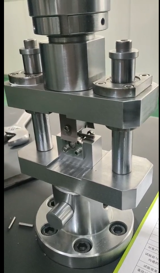 根據國標GB/T3851要求,試驗機精度不低于1%,試驗夾具采用三點彎曲夾具,下方是兩根自由平方的支撐圓棒,上方有一個自由平方的加力圓棒。將試樣對中地平方在支撐圓棒上,以每秒不超過200N的勻速加載。